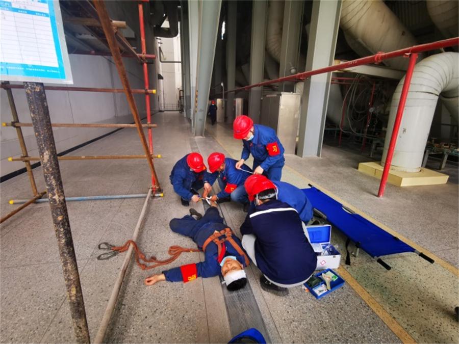 此次演練場(chǎng)景為2號(hào)鍋爐13米層,一名皖檢項(xiàng)目部鍋爐專(zhuān)業(yè)作業(yè)人員在腳手架上作業(yè)時(shí),由于未正確系掛安全帶,發(fā)生高空墜落,公司在得知事故發(fā)生后及時(shí)啟動(dòng)應(yīng)急救援預(yù)案,對(duì)墜落者積極實(shí)施搶救。