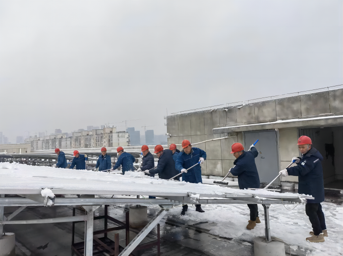 他們吃苦耐勞堅韌不拔,不畏艱辛迎難而上。面對惡劣天氣影響,運維組迅速響應,采取緊急措施保障電站的安全。2023年底、2024年初的幾場大雪,給各個光伏電站的運營帶來了嚴重影響,運維組成立應急小組,制定《光伏電站積雪清理及節(jié)假日設備消缺應急預案》,第一時間趕赴現(xiàn)場及時清除光伏組件積雪、排查安全隱患,積極應對凍雨、暴雪天氣,確保極端天氣下電站設備安全穩(wěn)定運行。